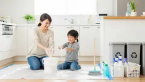 また、油性マジックやクレヨンが手や床についてしまった場合の汚れ落としにも有効です。「油汚れは油で浮かす」のが一番早いため、汚れた部分にオイルを馴染ませてくるくるとマッサージするように擦ると、汚れが浮き上がってきます。