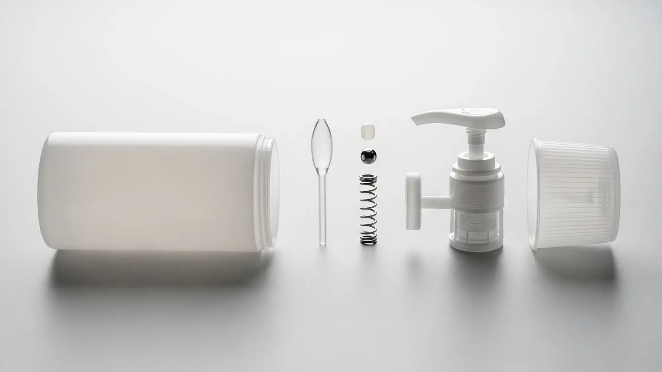 ポンプの内部には、液体を吸い上げるためのストロー部分(ポリエチレンなど)に加え、プッシュして戻る動作のための「金属製のバネ(スプリング)」や「ガラス球」が使われていることがあります。