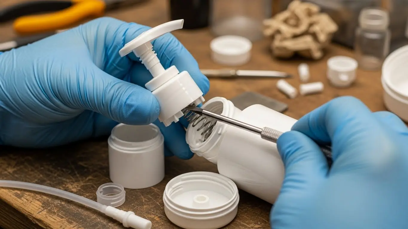 多くのポンプは、ノズル部分、キャップ部分、ストロー部分、そして内部のシリンダー機構で構成されています。まずはストローを引き抜きます。次に、キャップの内側を見て、爪で引っかかっている部分がないか確認します。