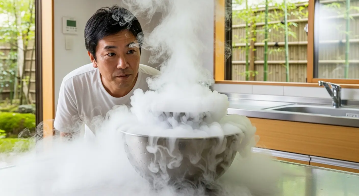 次に、水温についてです。「熱湯なら一瞬で消えるはず」と考えがちですが、沸騰した熱湯を一気に注ぐのは非常に危険です。昇華反応が激しくなりすぎて、熱湯が周囲に飛び散る「スプラッシュ現象」が発生し、火傷の原因となります。最初は常温の水か、お風呂のお湯程度のぬるま湯から始め、様子を見ながら徐々に足していくのが確実な手順です。また、この方法は自然放置と比較して、短時間で大量の二酸化炭素が発生します。キッチンの換気扇を「強」で回すか、窓を全開にして、十分な換気環境を整えてから行ってください。白い煙は見た目に楽しいものですが、直接吸い込むと酸欠のリスクがあるため、顔を近づけすぎないよう注意しましょう。