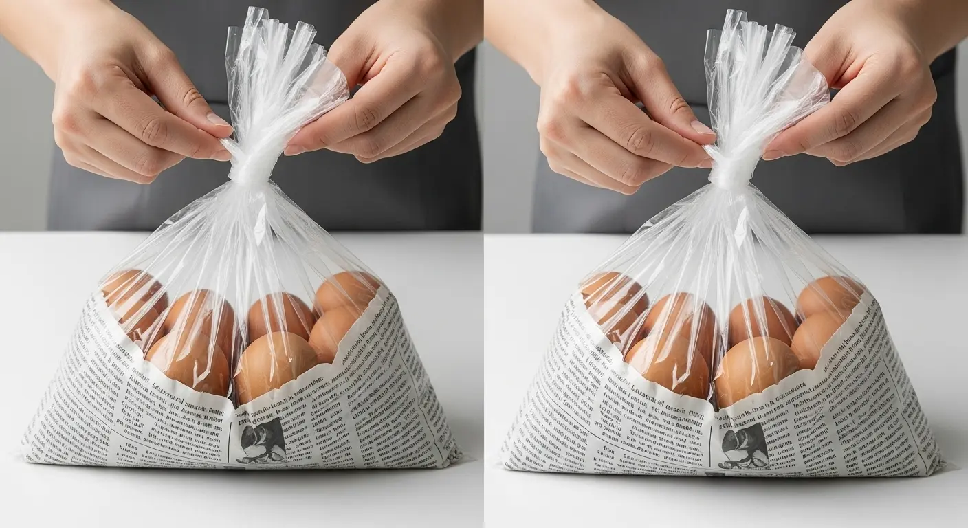 まず、ポリ袋の中に新聞紙をクシャクシャにして敷き詰めます。ただ敷くのではなく、丸めてから広げることで表面積が増え、吸水力が高まります。この「吸水層」が重要です。 - 卵を割って吸わせる