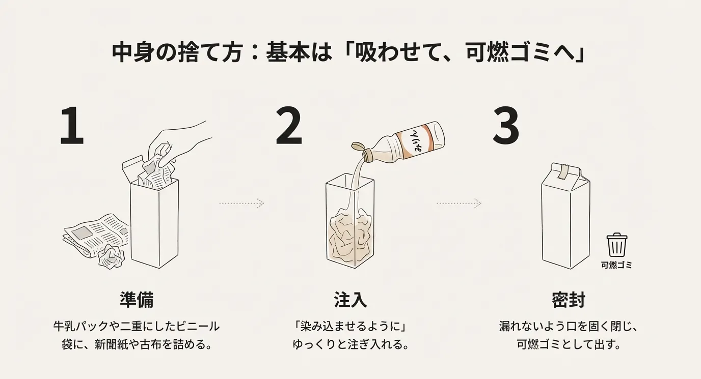 みりんの中身を可燃ゴミとして捨てるためには、液体を固体に近い状態に保持して処理するのが基本です。ここでは、最も一般的で周囲を汚さない「吸着法」の手順を具体的に解説します。