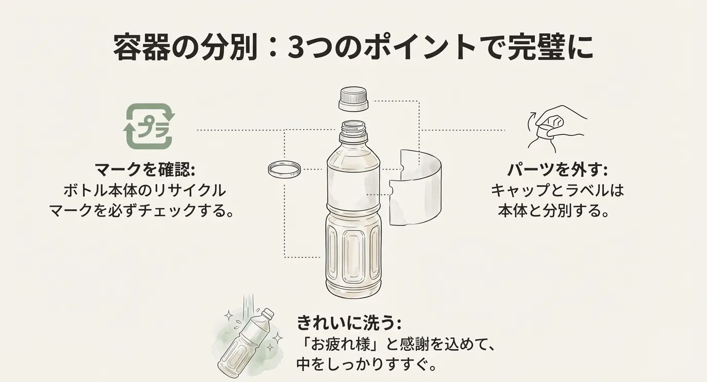 • 2025年現在の分別基準に合わせ、容器・キャップ・ラベルを正しく仕分ける