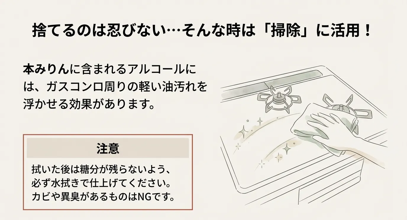 また、意外な活用法として「魚焼きグリルの消臭」があります。グリルを使った後の受け皿に、水と一緒に少しだけ期限切れのみりんを垂らしておくと、アルコールの揮発と共に生臭さを和らげてくれることがあります。