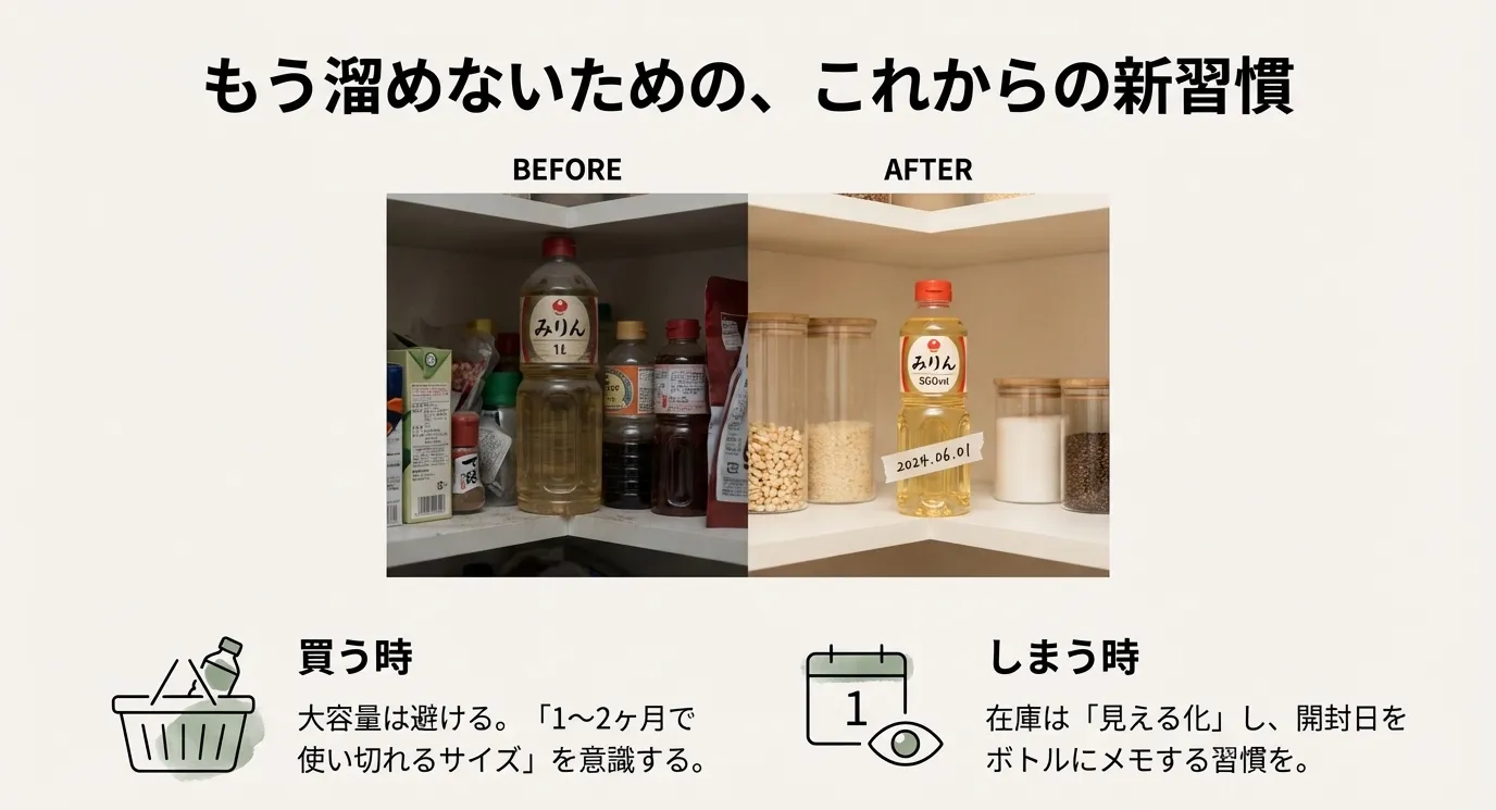 断捨離の真のゴールは、捨てた後に「リバウンドさせないこと」です。二度と同じようにみりんを無駄にしないために、これからの買い方と収納のルールを見直してみましょう。