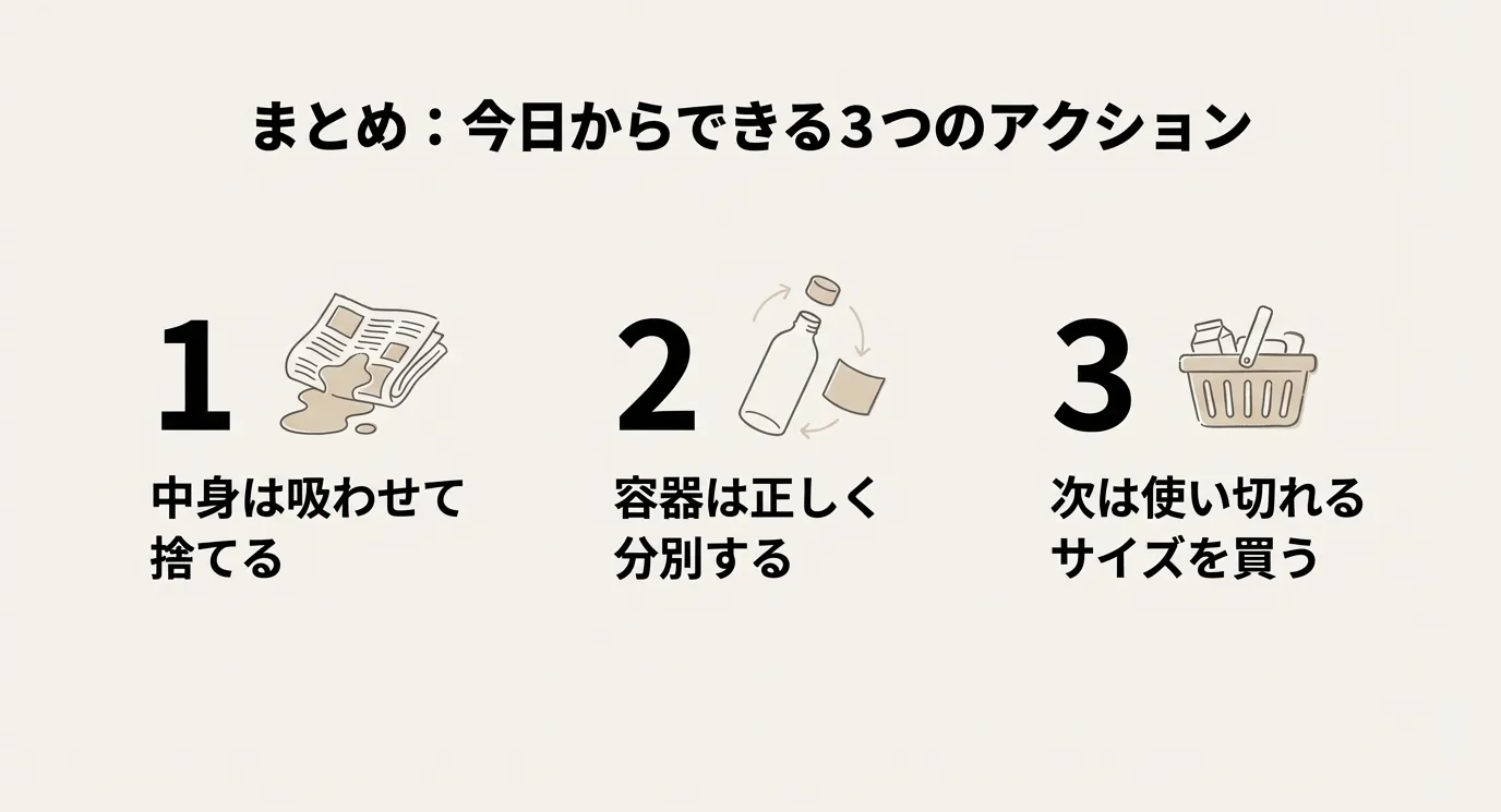 作業はシンクの中で行うと、万が一こぼれた際も安心です。最後に可燃ゴミの袋に入れて指定の日に出せば完了です。このひと手間を加えるだけで、環境を汚さず、かつ安全に液体を処理することができます。